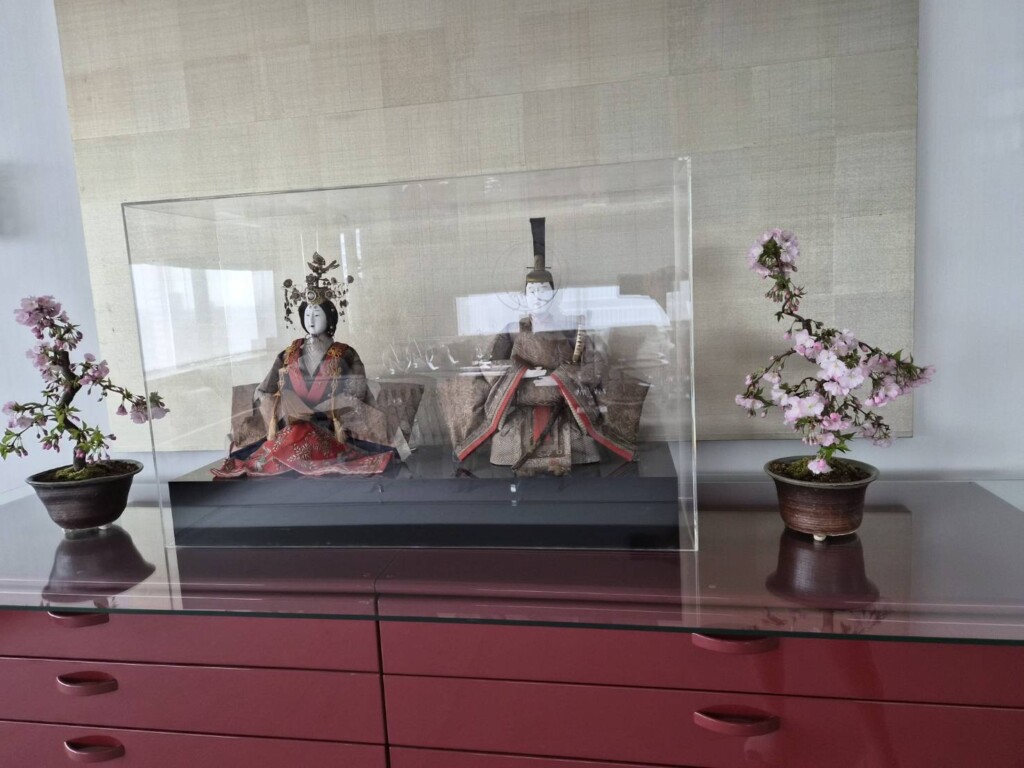 今回ご紹介する写真は、二体のお雛様を、ふたつの桜の盆栽が優しく囲む、