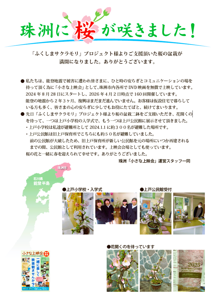 珠洲「小さな上映会」運営スタッフの皆さまより、 お送りした“ふくしまサクラ”の盆栽が満開になったとの報告が届きました。